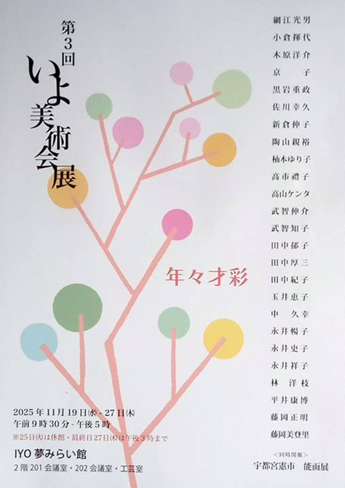 第3回 いよ美術会展 会場:IYO夢みらい館 2階 会期:2025年11月19日(水)~11月27日(木) 時間:9:30~17:00(最終日は15:00まで) 休館日:火曜日 By 愛媛県美術会|2025-11-25T10:31:15+09:002025年11月12日|全て, 展覧会情報, 美術会会員| この投稿をSNSでシェア FacebookTwitterRedditLinkedInTumblrPinterestVk電子メール