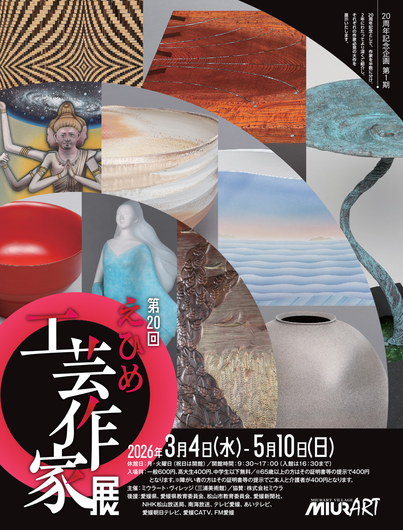 第20回えひめ工芸作家展 会期:2026年3月4日(水)~5月10日(日) 会場:ミウラート・ヴィレッジ 住所:松山市堀江町1165-1 時間:9:30~17:00(入館は16:30まで) 休館日:月・火曜日(祝日は開館) 愛媛県美術会2026-03-06T09:48:30+09:002026年03月06日| この投稿をSNSでシェア FacebookTwitterRedditLinkedInTumblrPinterestVk電子メール